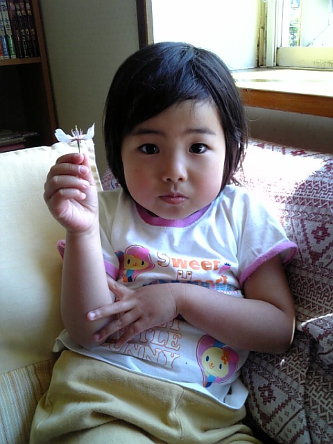 子どもたちはみんな外で遊んでいるので、私はパソコン部屋のソファに寝ころび買ってきた本を読んでいたら、サクが「サクとおなじなまえのはな~」と、桜の花を持ってきた